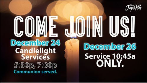 This year we are excited to be back live and in person again for another Christmas Eve service. This year the times are 5:30pm & 7:00pm. Seating usually fills pretty quickly so try to arrive a little early this year. Service will be less than an hour and will have some special music in the lobby. Bring your entire family to OHills for Christmas Eve. The service will be streamed on our website (click "Watch Live" in the tool bar above), the OHills church app, Facebook and Youtube.